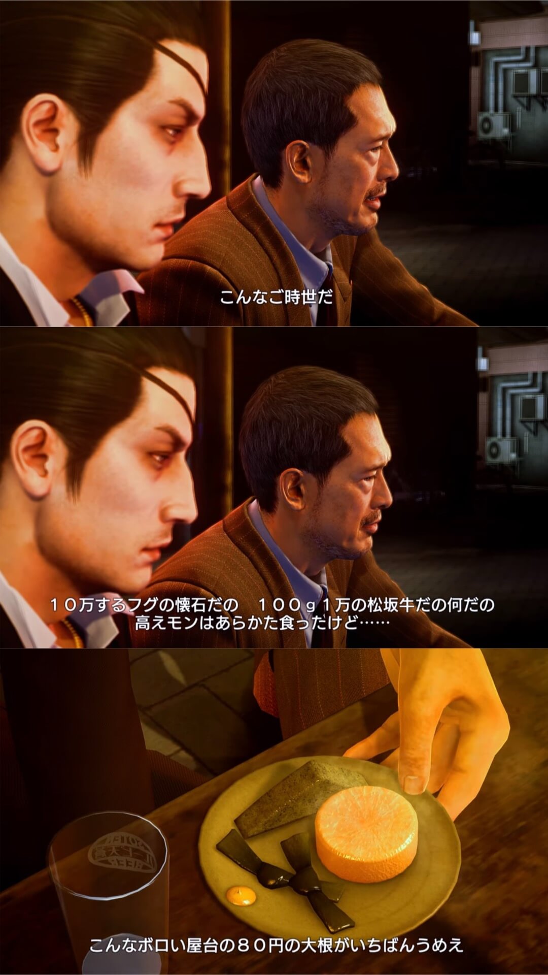 桐生ちゃんのダーティーな食生活が。龍が如く3の神田のような体型になっていないのは主人公補正でしょうか。ボディメイクは「食事8割・運動2割」ですからね。